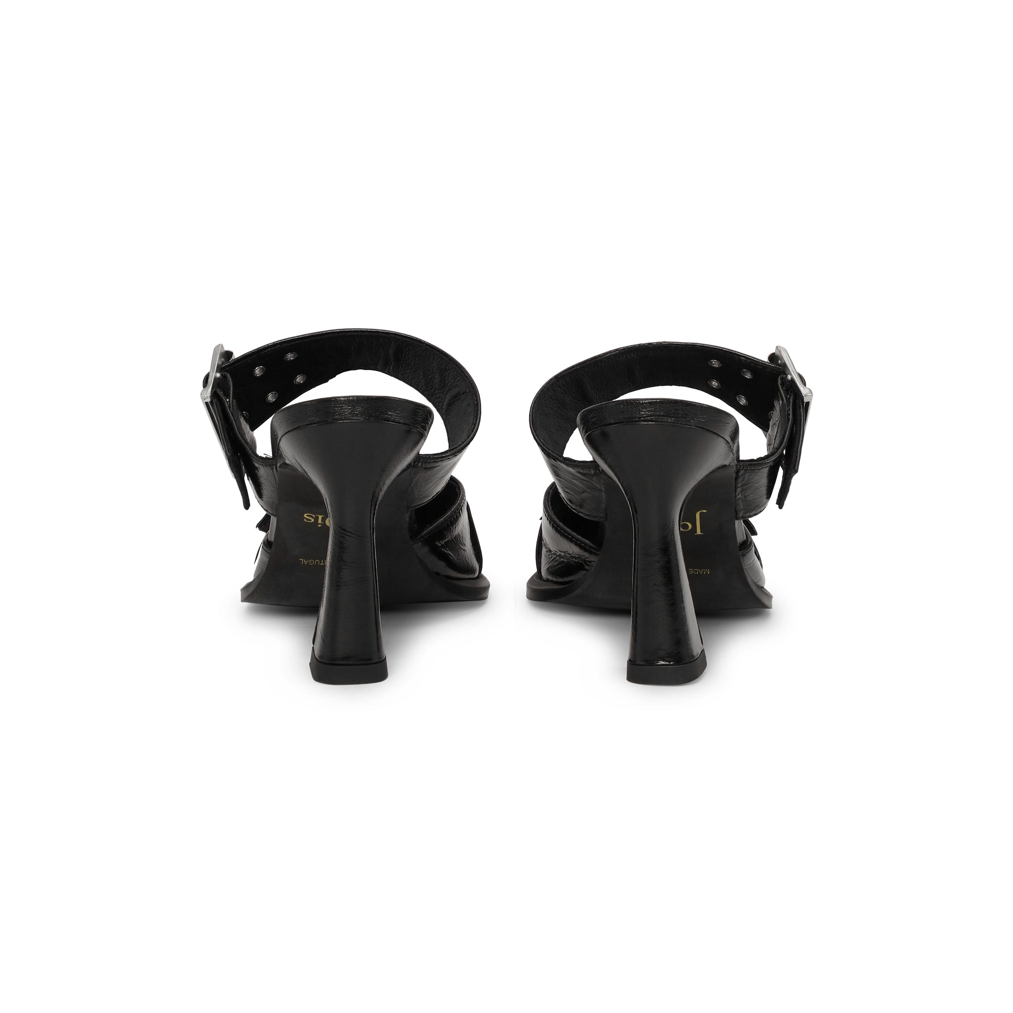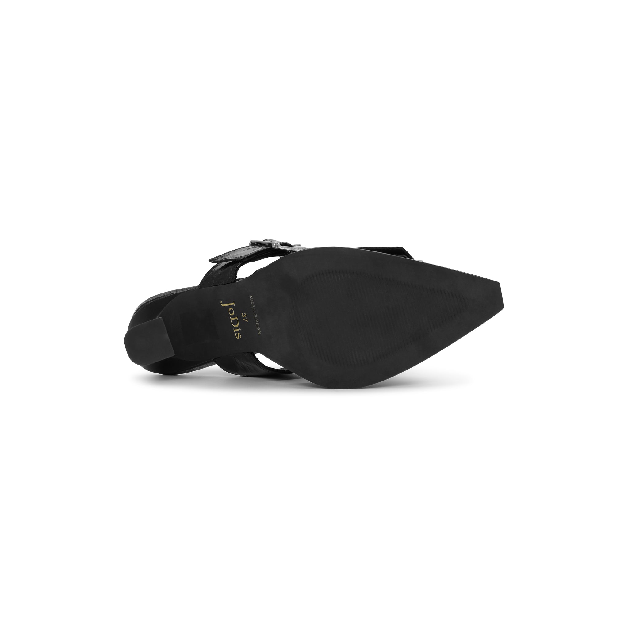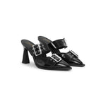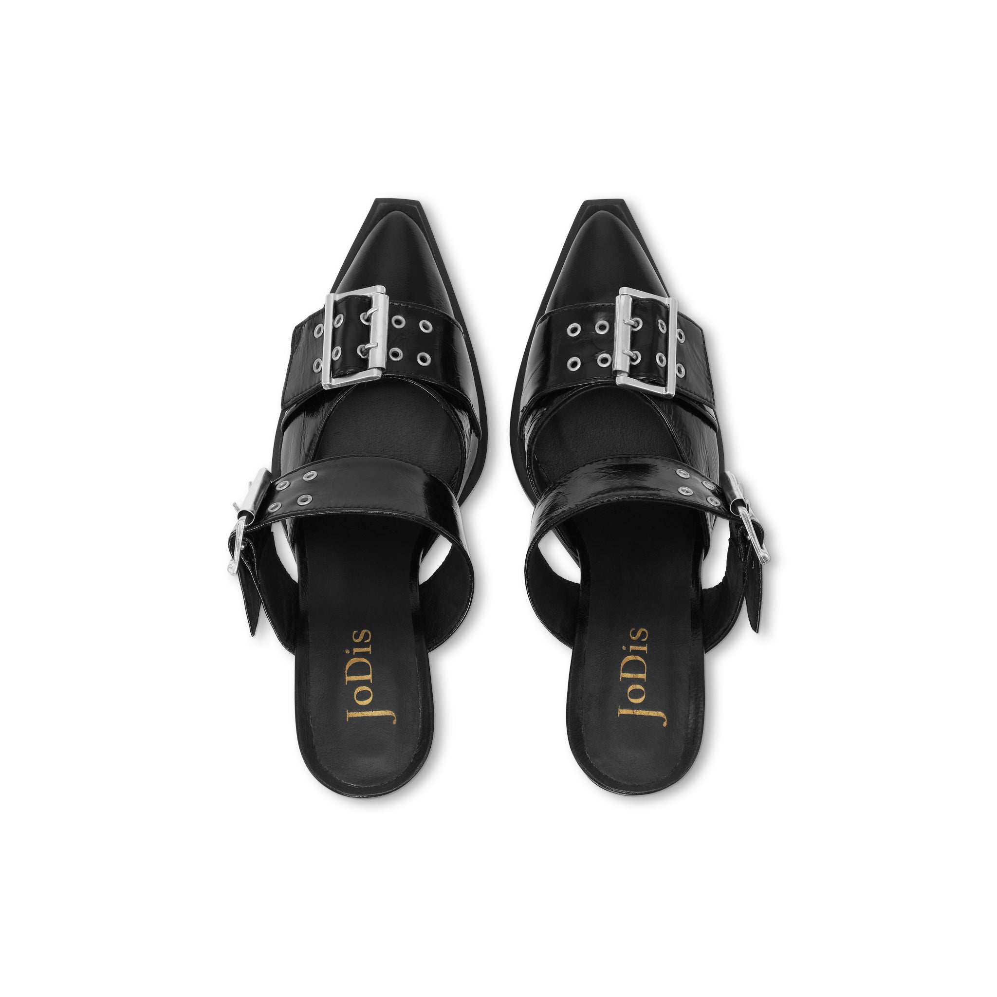 KLEO Black patent combines luxury and style with its decorative metal buckles and pointed toe. With its slim 8 cm high heel, this shoe is both sophisticated and versatile, perfect for everyday wear and festive occasions. The ideal choice for those who want to stand out with luxurious details and timeless design.