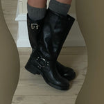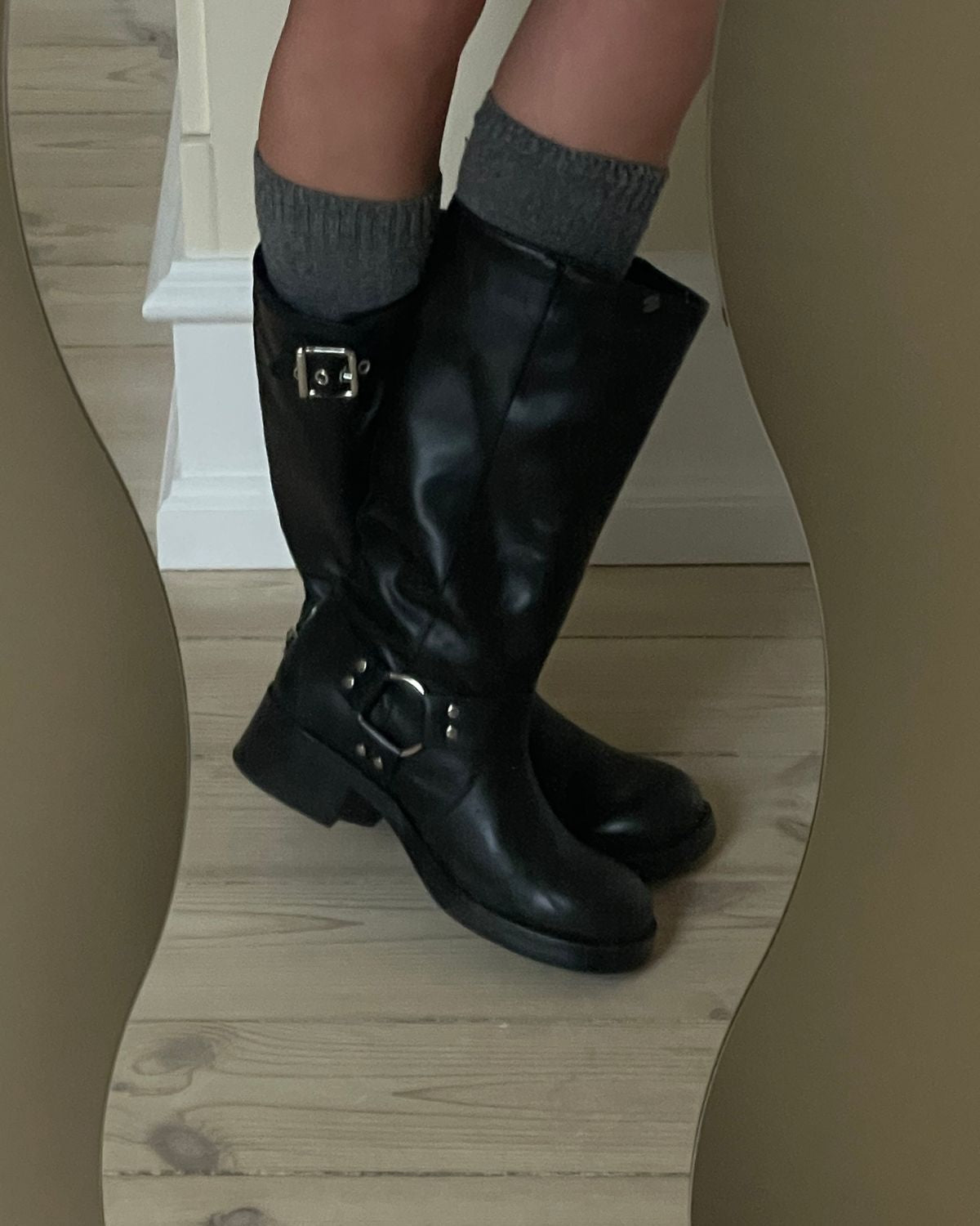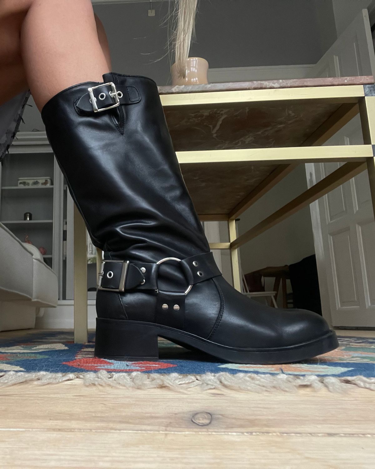 Saxy Biker Boots , is a boot that combines timeless design with a modern biker style. Crafted in black luxury leather, this model offers a rounded toe as well as distinctive harness details around the ankle and shaft. The adjustable buckle provides optimal comfort and a personal fit. With its practical slip-on function, these boots are easy to put on and take off. The raw metal details and robust design add an authentic biker look, perfect for those who want a stylish and angular boot.